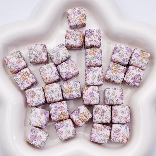Cute Little Monster Doll Figure Flowers Printed Cube Square Silicone Beads, 14MM