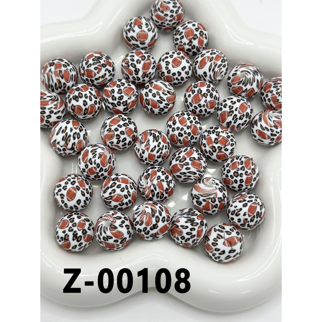 ブラウン アメリカンフットボール ジャガー ヒョウ柄 ラウンドプリント シリコンビーズ 15mm、番号 Z-00108