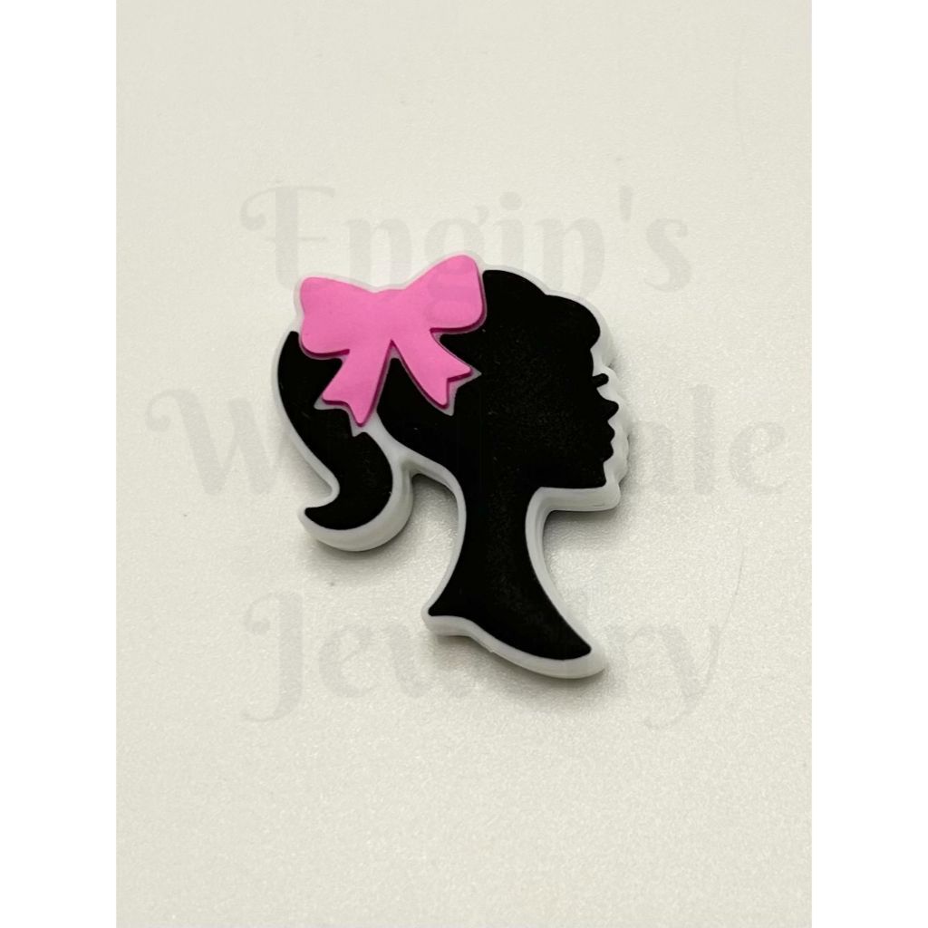 - ピンクのリボンが付いた漫画バービーのシリコン製フォーカルビーズ。あなたのジュエリー作品に遊び心のある魅力を今すぐ加えましょう。