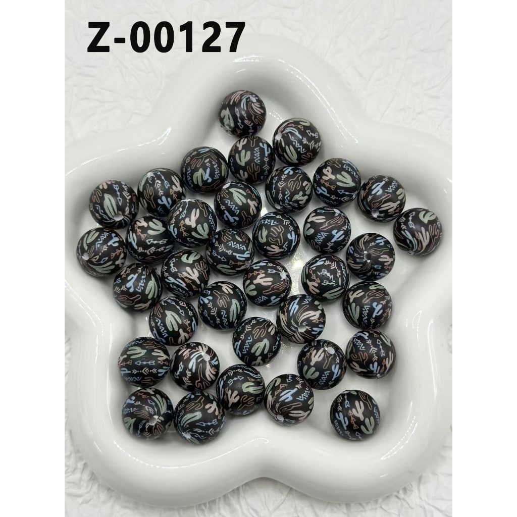 セレウスサボテン アブストラクトデザイン ブラック ラウンドプリントシリコンビーズ 15mm、番号 Z-00127