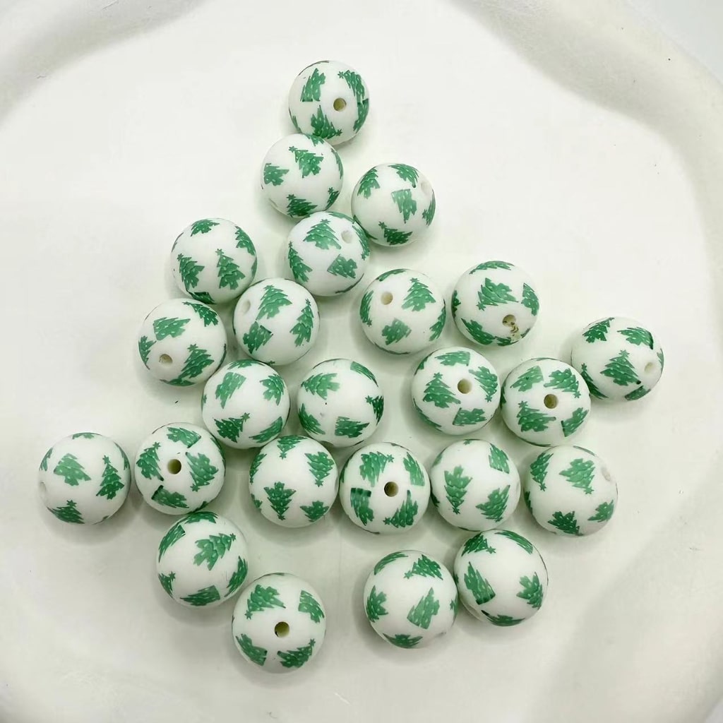 クリスマス パインツリー柄 ラウンドプリント シリコンビーズ 15mm、番号 Z-51