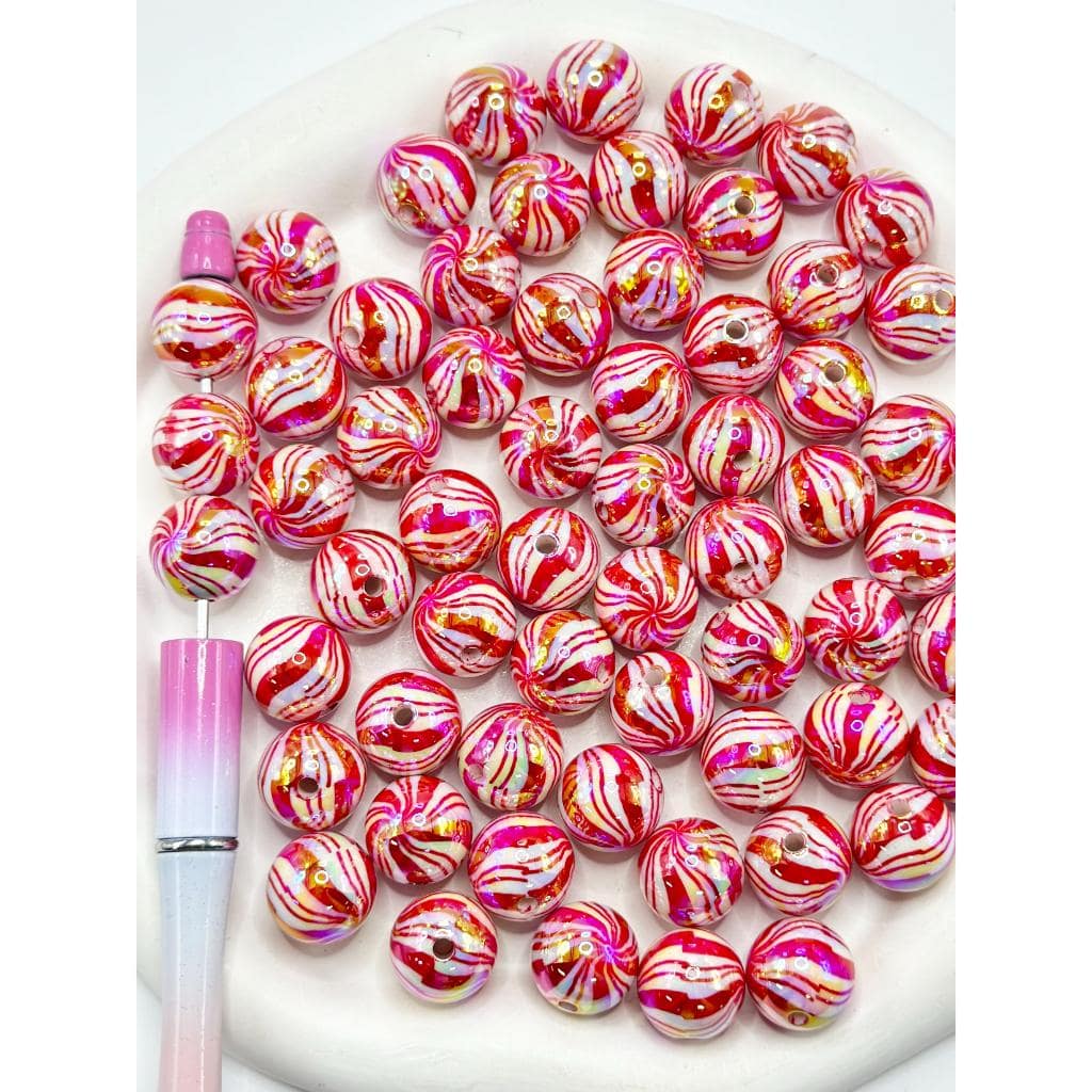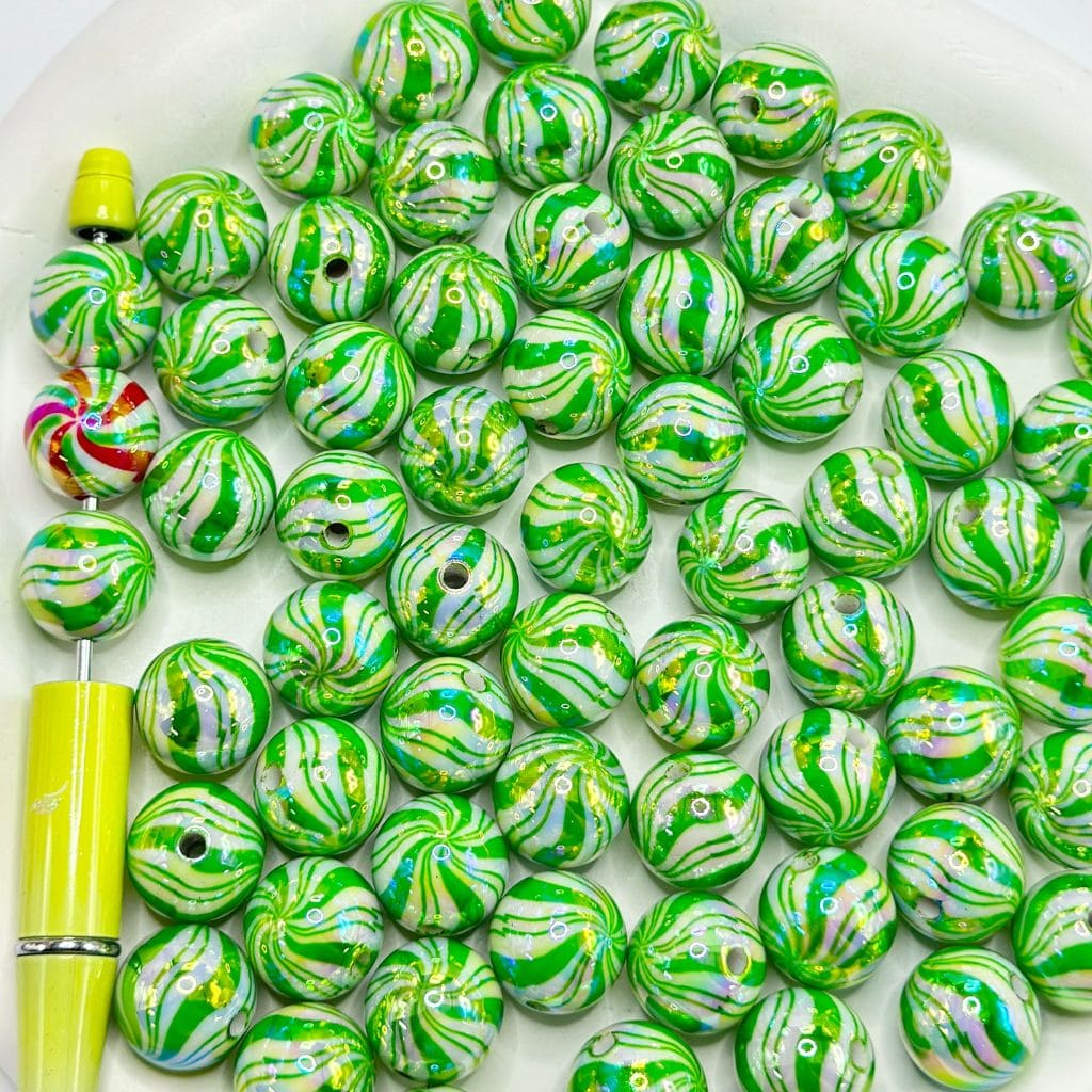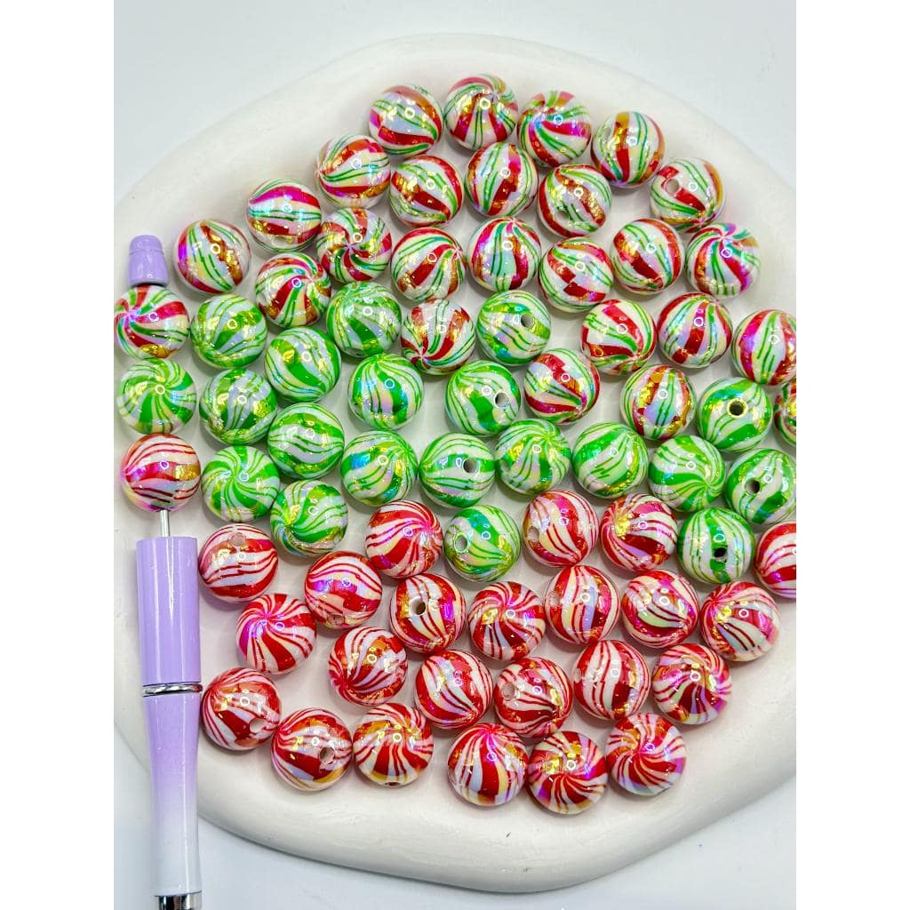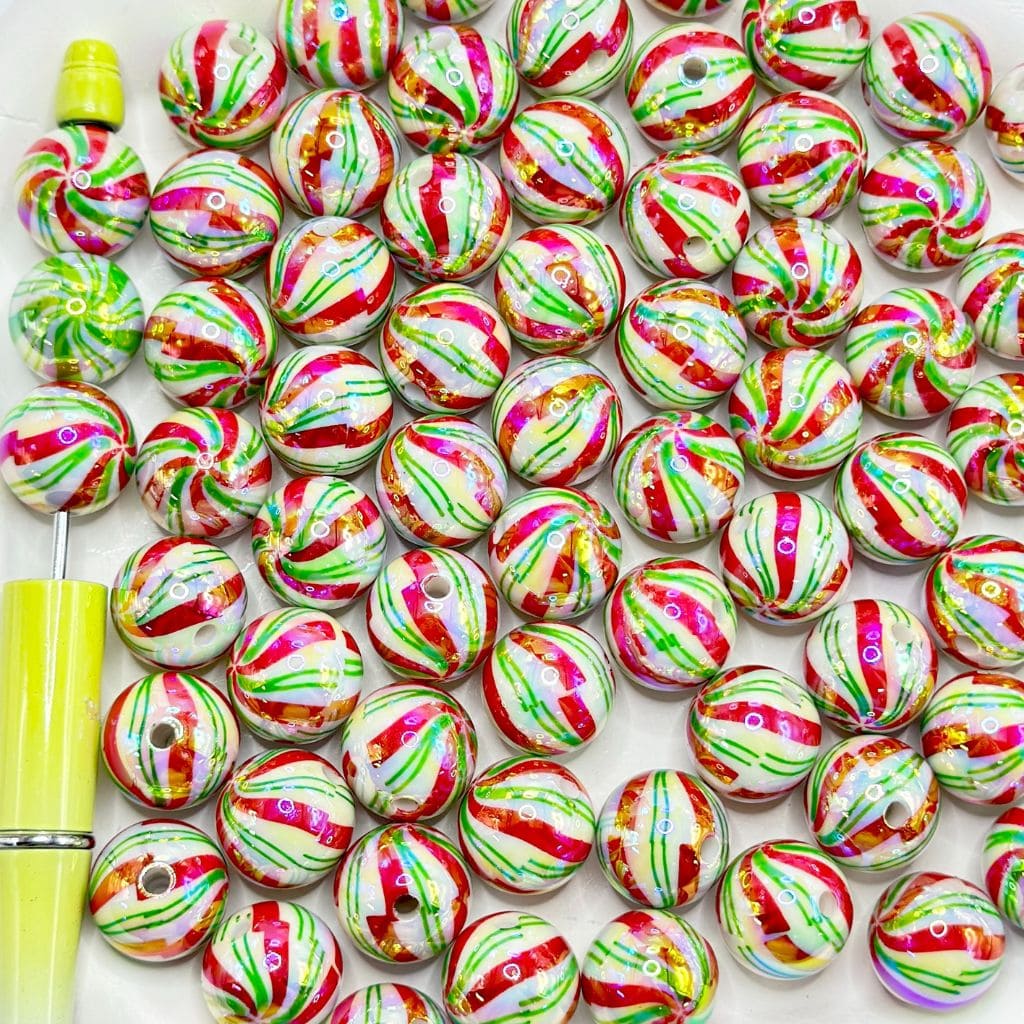 クリスマスの赤と緑のカラフルなストライプラインの丸いアクリルビーズ、ランダムミックス、16MM
