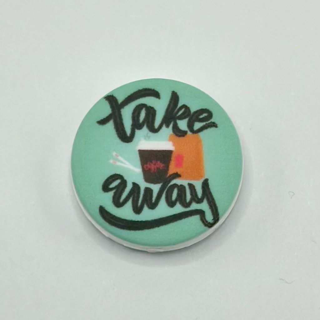 コーヒーカップとテイクアウトバッグと「Take Away」の文字が入った丸型シリコンフォーカルビーズ
