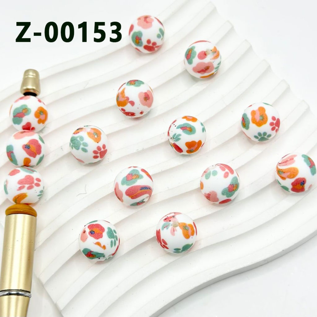カラフルで可愛い子犬の足跡がプリントされた丸型シリコンビーズ 15mm、番号 Z-00153