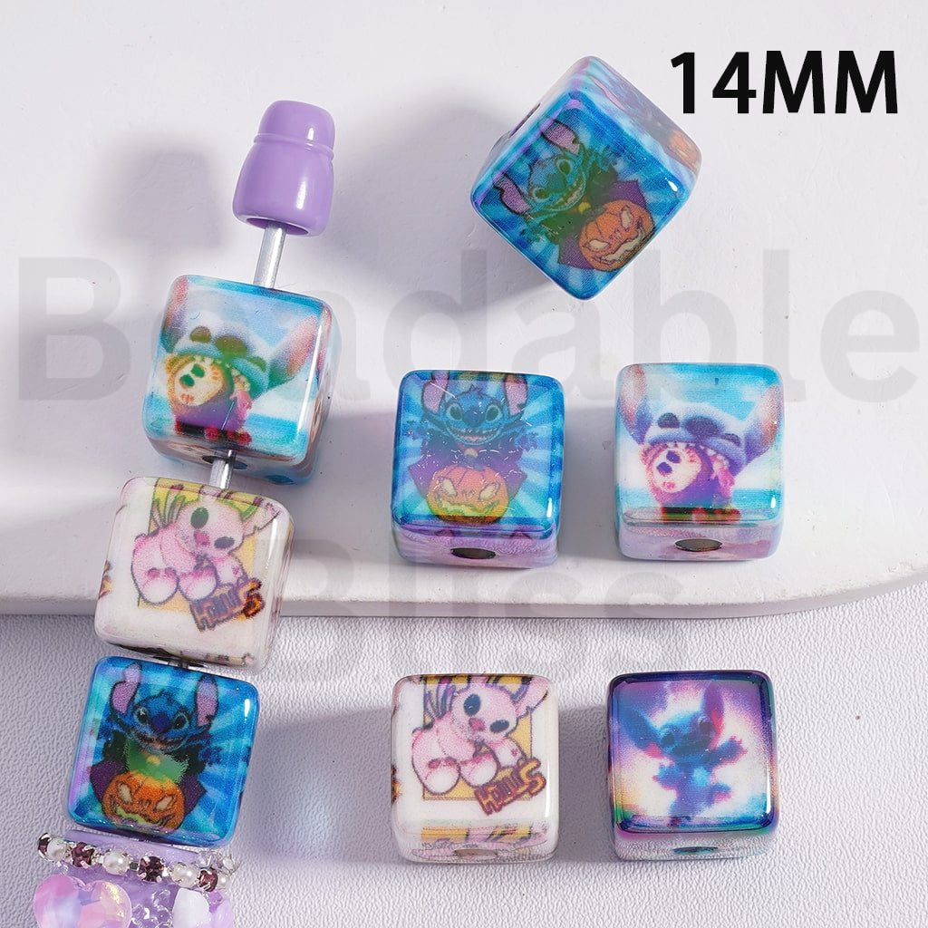 Cube Square Acrylic Beads UV Coating Cute Blue & Pink Blue Creature Spooky Face Pumpkin Halloween 14MM, Random Mix