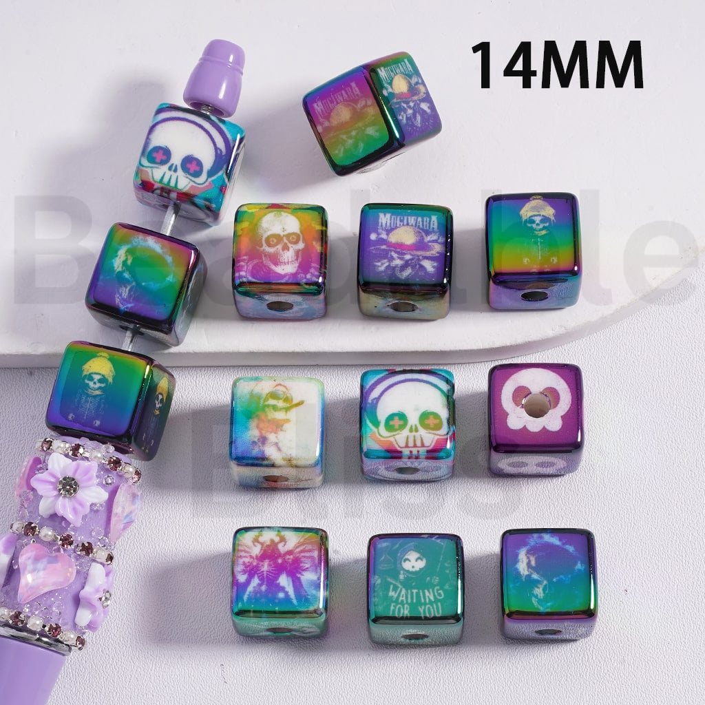Cube Square Acrylic Beads UV Coating Helloween Skeleton Head 14MM, Random Mix