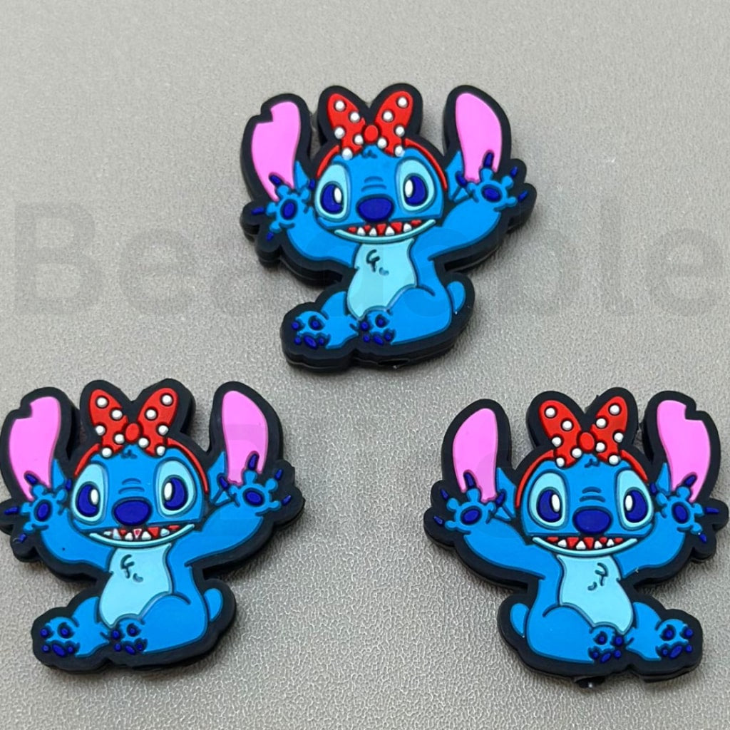 赤い蝶結びのシリコン製フォーカルビーズが付いたかわいい青いステッチ