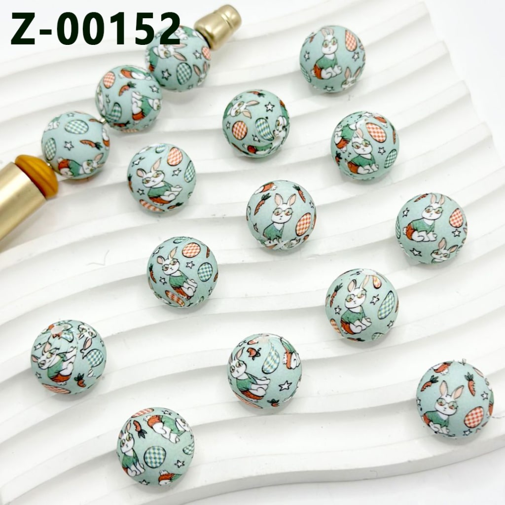 かわいいウサギ、ニンジン、星、卵、イースターの丸型プリントシリコンビーズ 15mm、番号 Z-00152