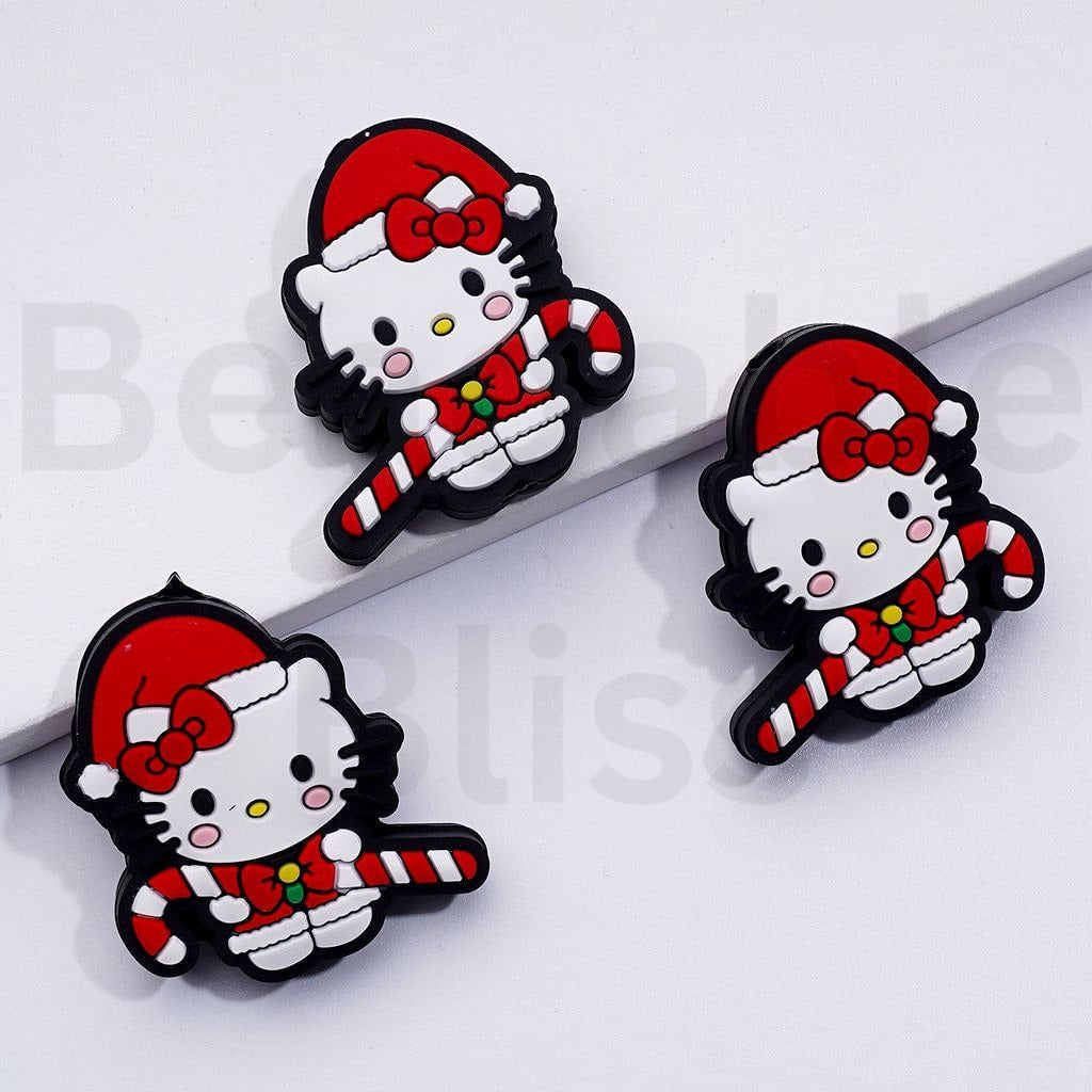 赤いクリスマス帽子をかぶった可愛い香港の子猫と蝶結びのキャンディスティック、シリコン製フォーカルビーズ