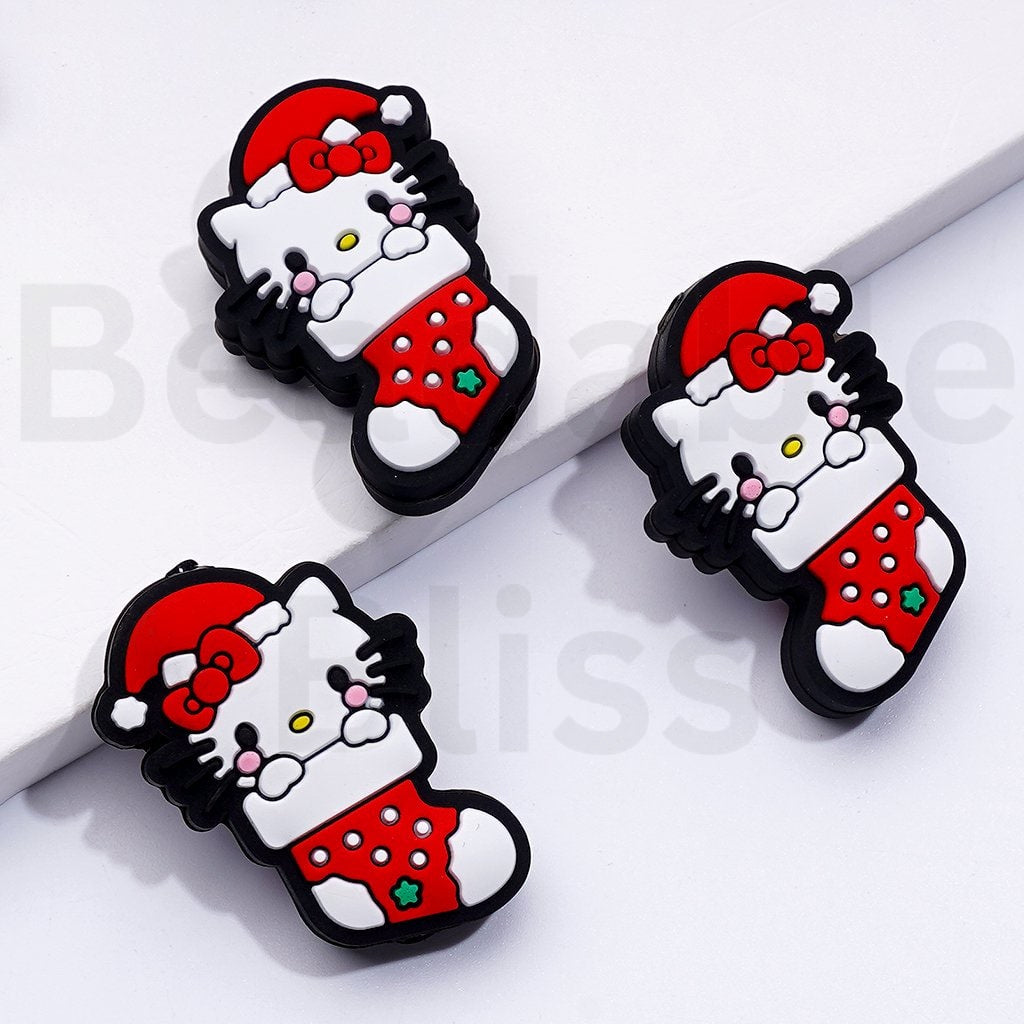 赤いクリスマス帽子をかぶったかわいい香港の子猫が赤いクリスマスソックスのシリコンフォーカルビーズに座っています