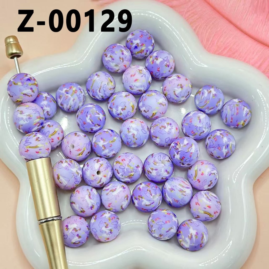 かわいいユニコーンレインボーライトパープルラウンドプリントシリコンビーズ15mm、番号Z-00129