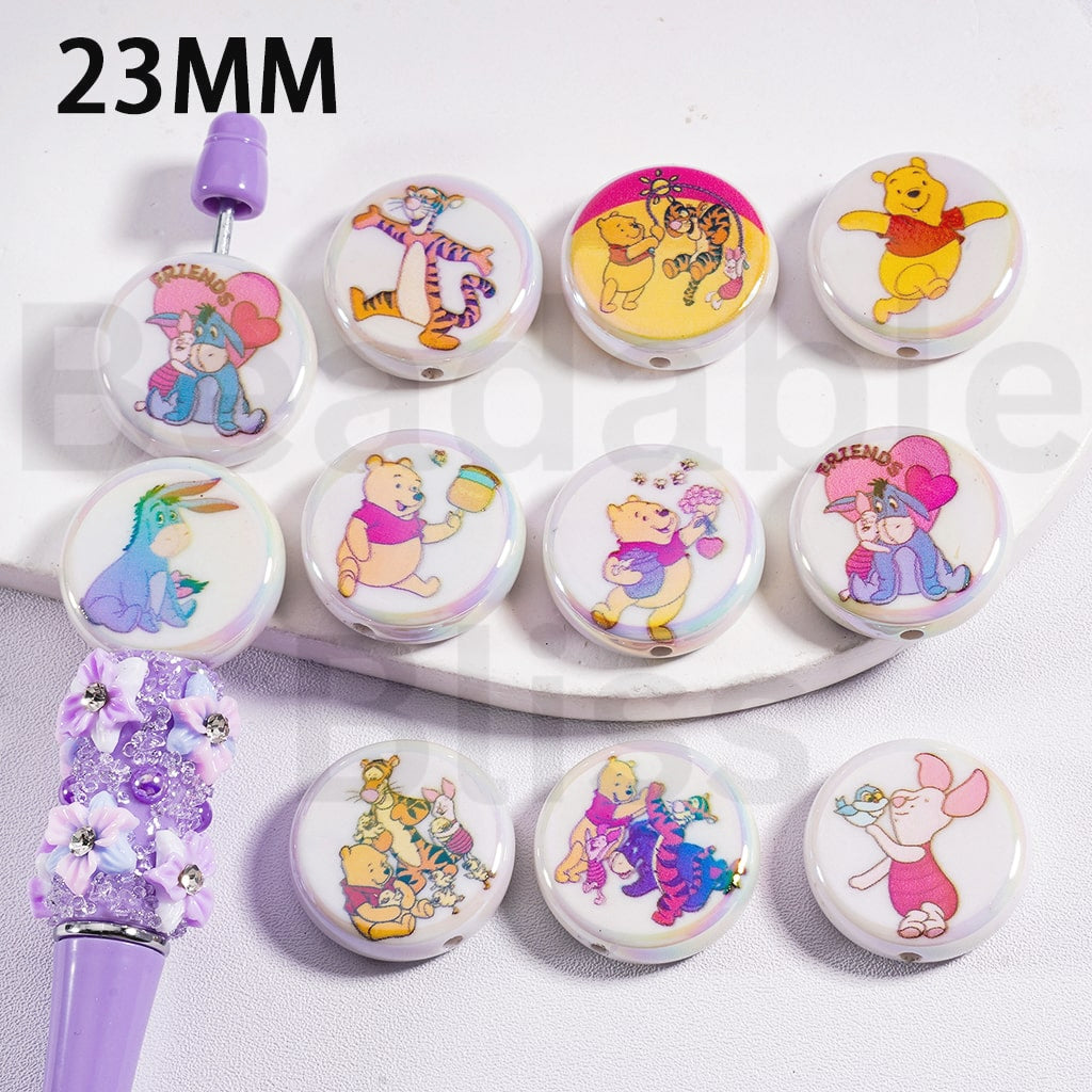 Flat Round Acrylic Beads UV Coating Cute Winni the Poo White 23MM, Random Mix