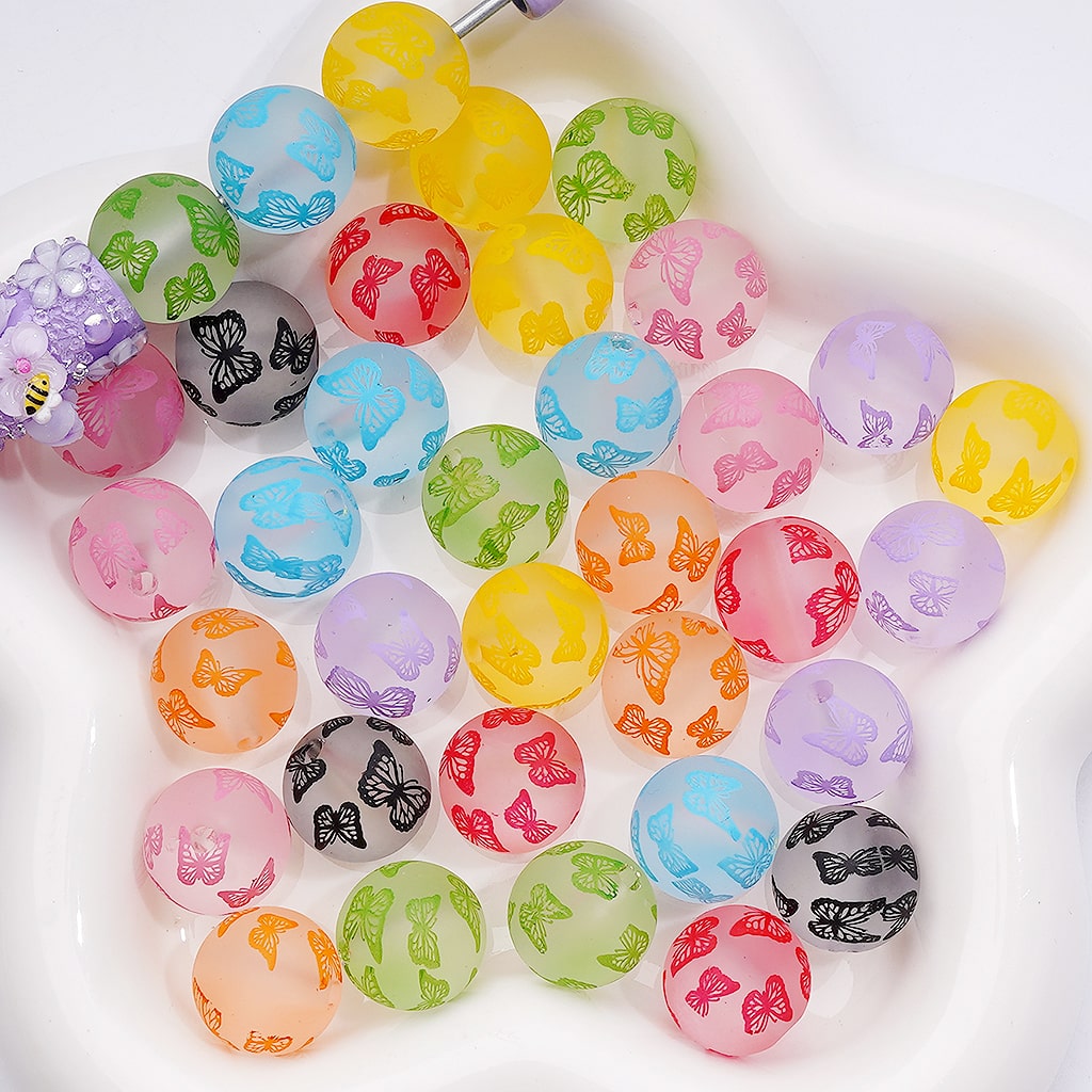 Frosted Multi-Color Cute Butterfly Prints Round Acrylic Beads, 16MM (Single Color is available for 200pcs(Whole Bag))