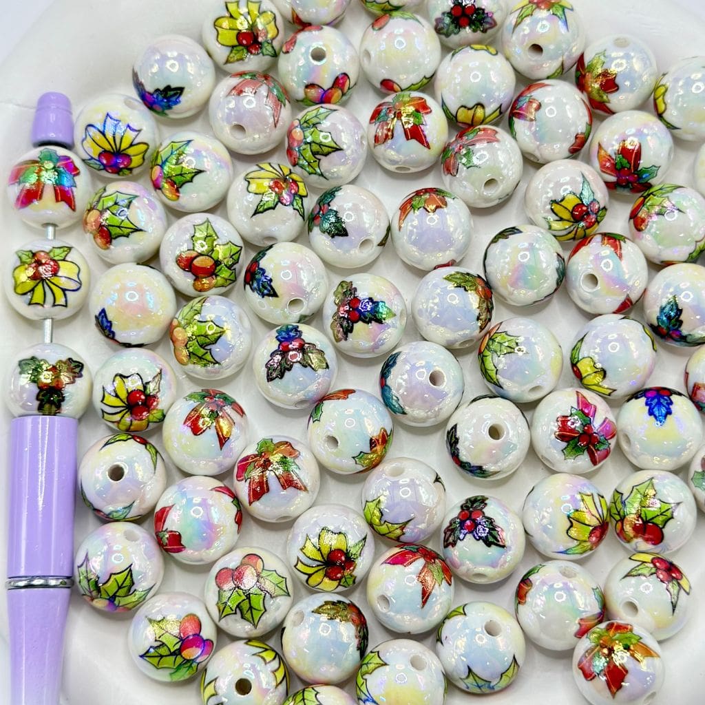 クリスマスオーナメントの葉っぱ、丸いアクリルビーズにプリント、ランダムミックス、16mm