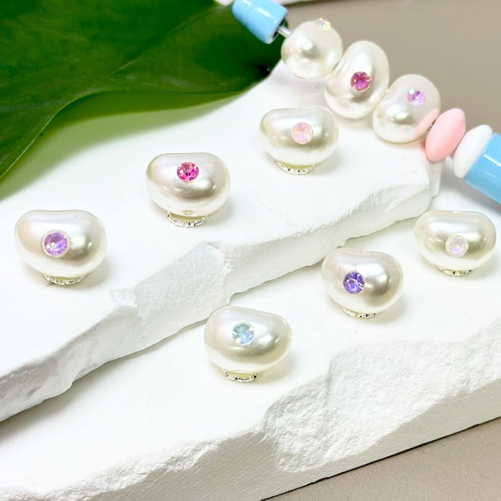 光沢のあるパールホワイトの豆型アクリルビーズとカラフルなミニラインストーン、約16×12mm、ランダムミックス