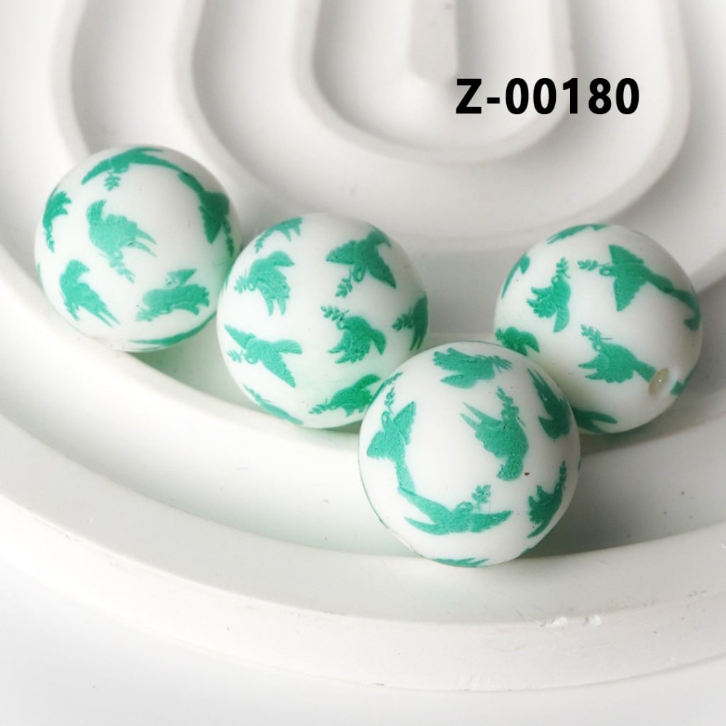 グリーンバードピジョンズ ホワイト ラウンドプリントシリコンビーズ 15mm、番号 Z-00180