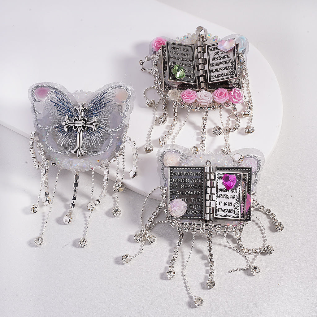 繊細なファンシーガンブラック合金ブック、透明ラインストーンチェーン付き、大きな三日月、砂糖で覆われた絶妙な生地の蝶、ミニかわいい花、ハート、星、ダイヤモンドビーズ、約59×45MM、ランダムミックス