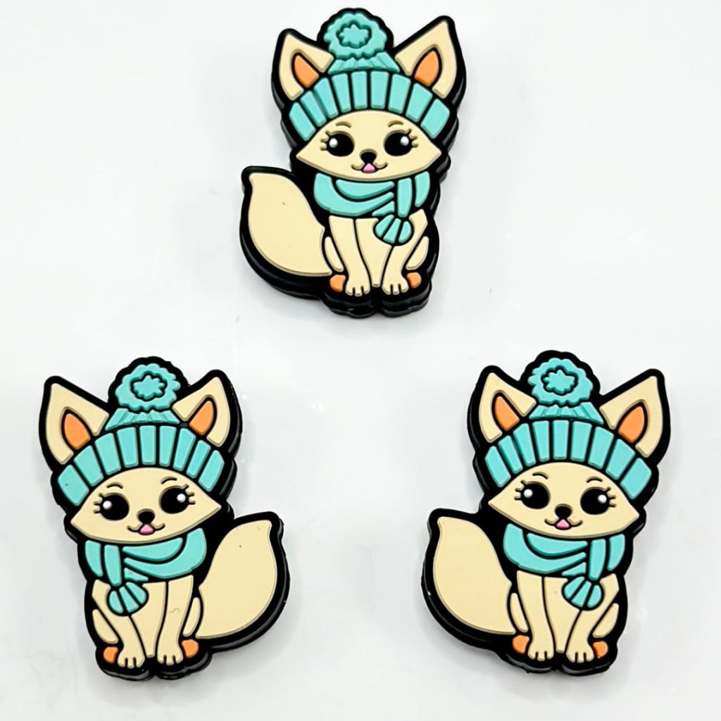 ティール色のスカーフハットをかぶった愛らしいキツネのシリコン製フォーカルビーズ