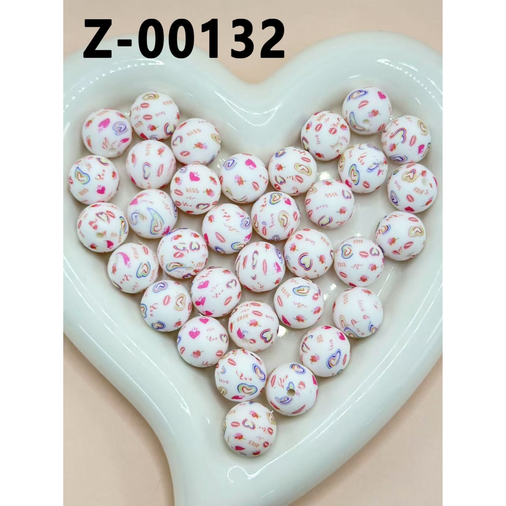 ラブバレンタイン ハートキス ホワイト ラウンドプリント シリコンビーズ 15mm、番号 Z-00132