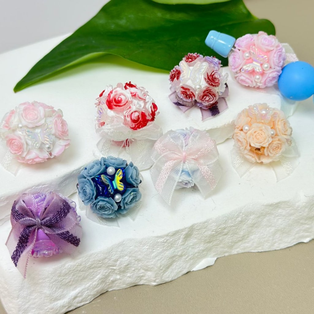 マルチカラーのかわいい花、白い真珠、光沢のある蝶、白い布の蝶結び、ラウンド粘土ビーズ、ランダムミックス、20MM
