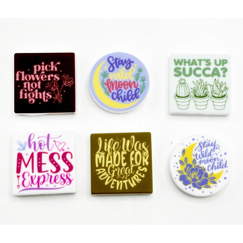 花を摘んで、喧嘩はしない。ワイルドでいよう。ムーンチャイルド。調子はどう?サッカ・ホット・メス・エクスプレス。素晴らしい冒険のために作られたようなもの。シリコンフォーカルビーズ、ランダムミックス。