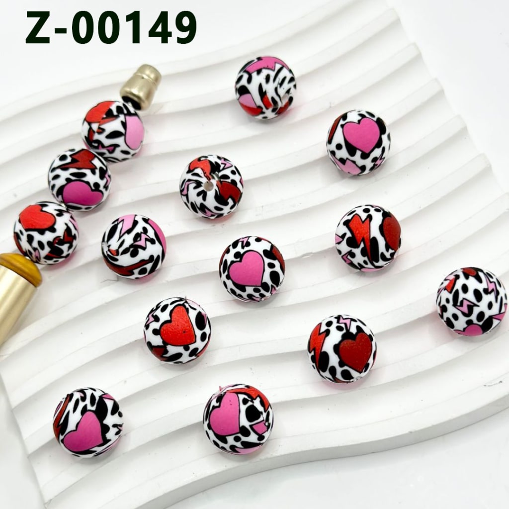 ピンクレッドライトニングハートカウプリントラウンドプリントシリコンビーズ15mm、番号Z-00149