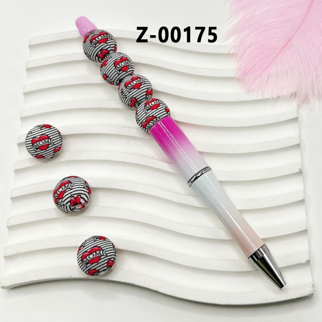 赤いハートのママ 母の日 ブラックライン ラウンドプリントシリコンビーズ 15mm 番号 Z-00175