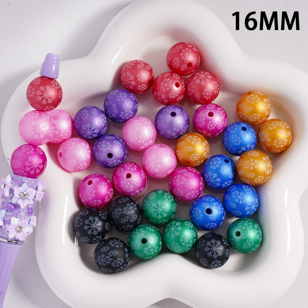 Acrylic Beads Frosted Matte Snowflakes Prints Christmas, Solid Color, 16MM