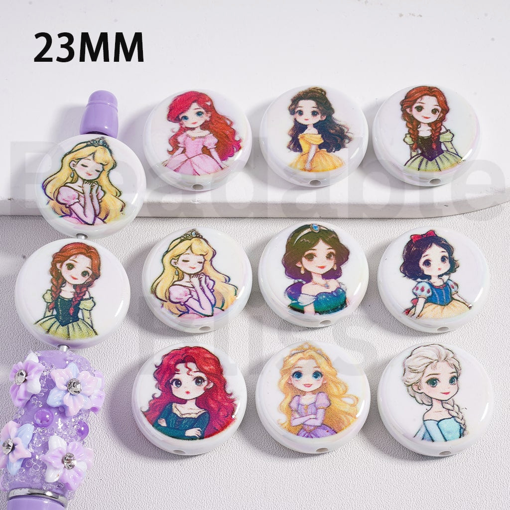 Acrylic Beads Round Flat UV Coating Cute Disne Princess Snow Whit Ann Auror Arie Bell Sofi Merid Rapunze Els, 23MM, Random Mix
