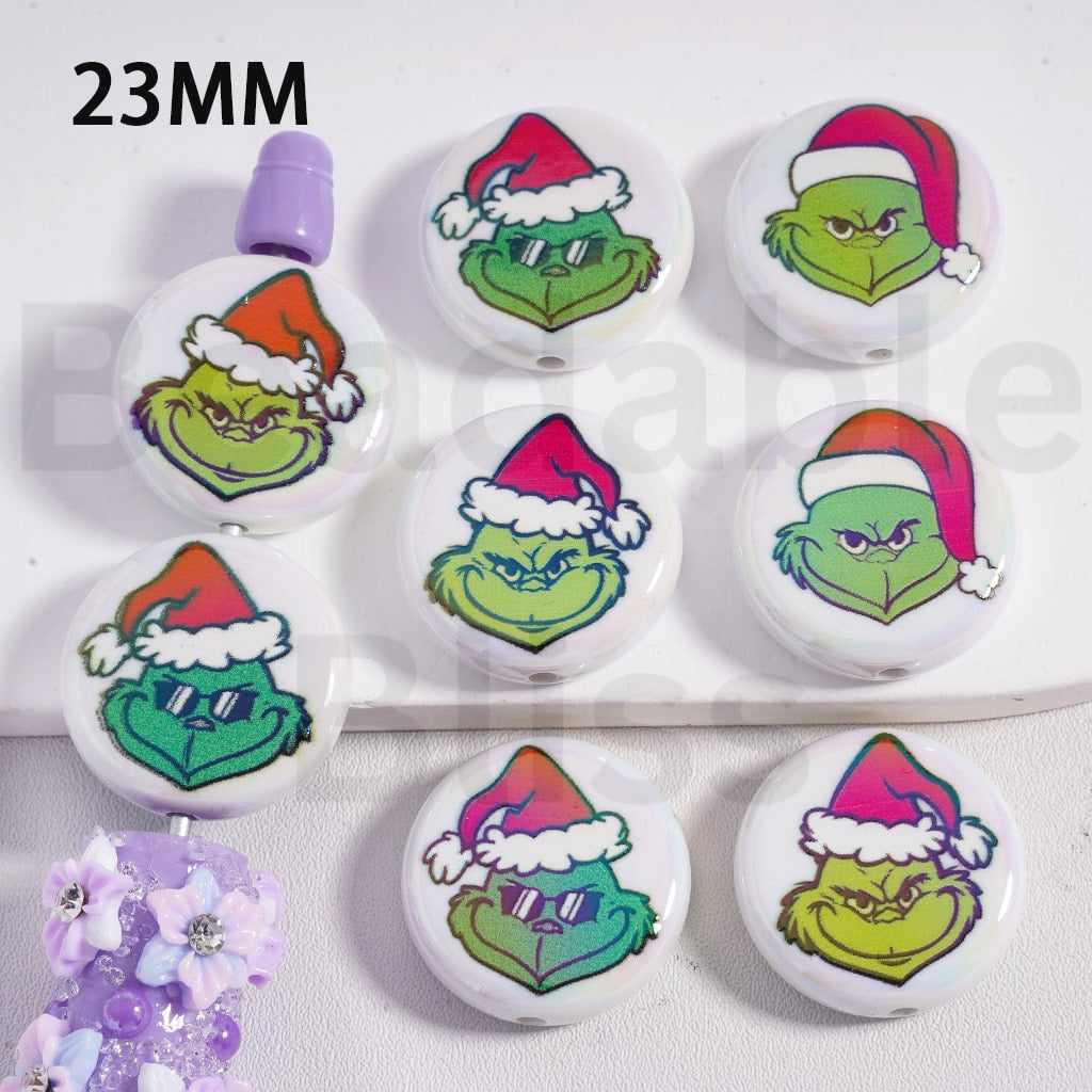 Acrylic Beads Round Flat UV Coating Green Monster Grinc with Red Christmas Hat, White, 23MM, Random Mix