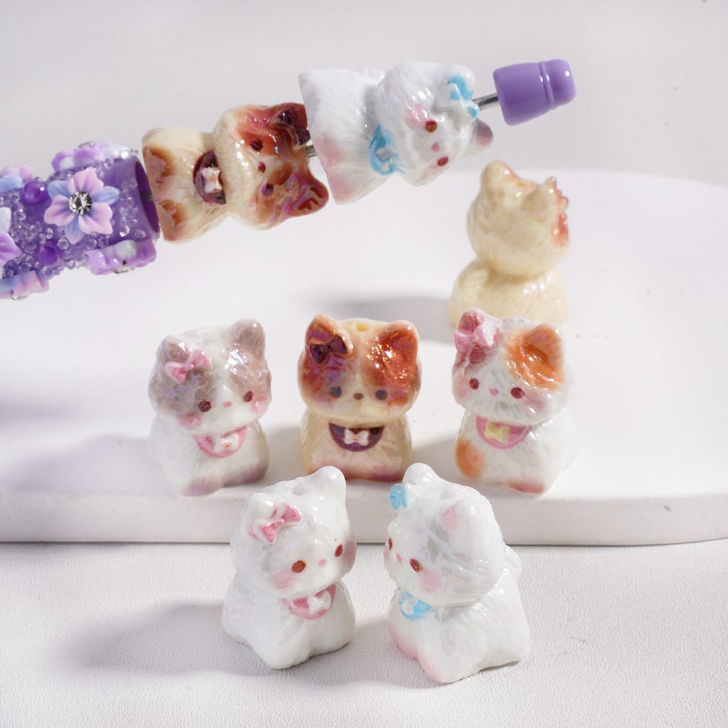 Acrylic Beads UV Coating Cute Cat Kitty with Bowknot, Random Mix