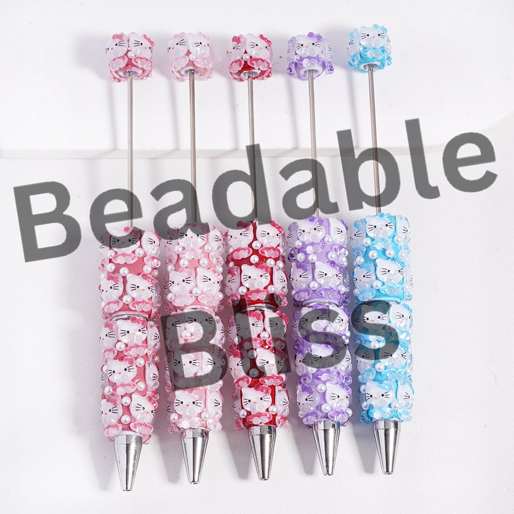 Beadable Clay Pen Shy and Cute Cat Character Wearing Skirt with Bowtie on Head and White Pearls, Multi-Color