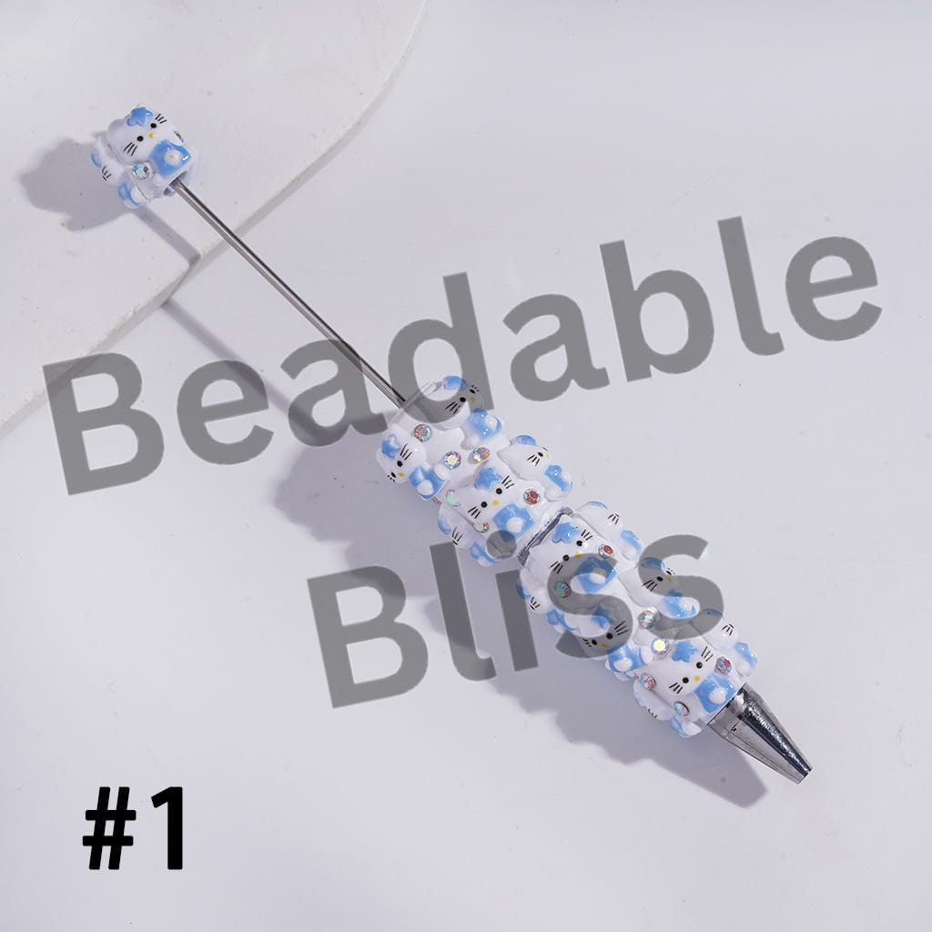 Beadable Clay Pens with Cute Cat Character Wearing Star on Head, AB Rhinestones and White Pearl, Multi-Color