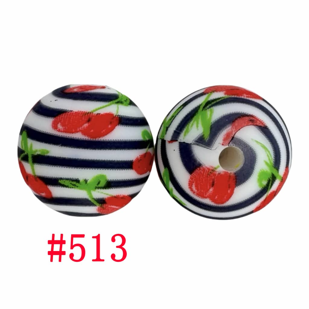 Black and White Swirl Stripes with Cherries Printed Silicone Beads, 15mm, Number 513