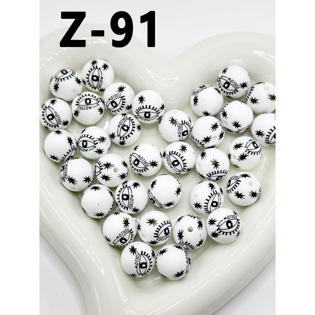 Black Big Eyes Follow White Round Printed Silicone Beads 15mm, Number Z-91