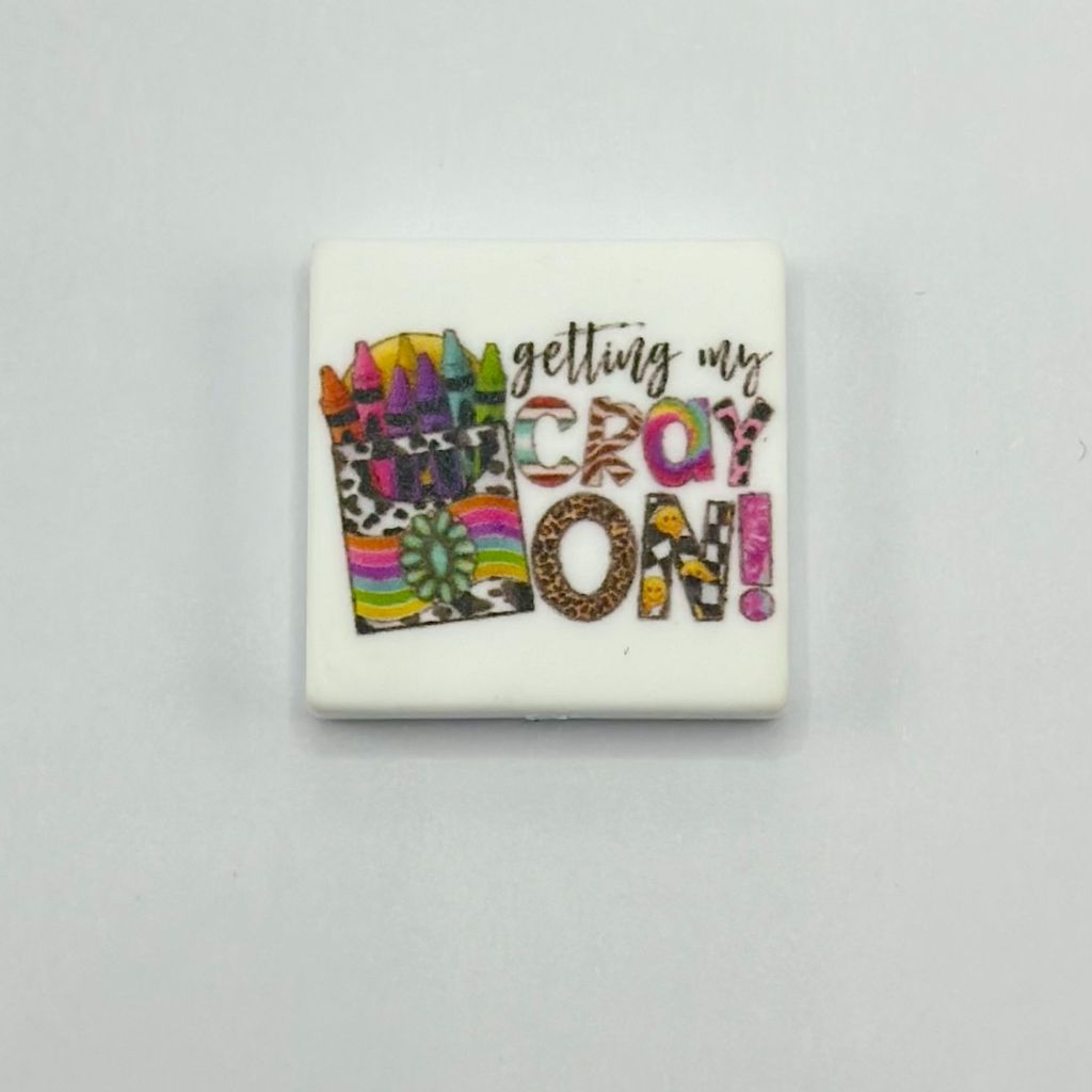 Colorful Crayons in a Box with Text ''Getting My Cray On'' Silicone Focal Beads