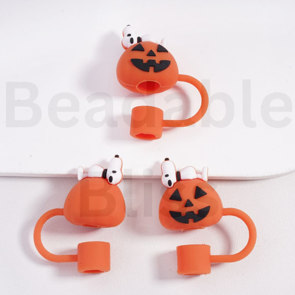 Cute Dog Plushie Lies on the Spooky Face Pumpkin Halloween Food Grade Cup Tumbler Silicone Straw Topper