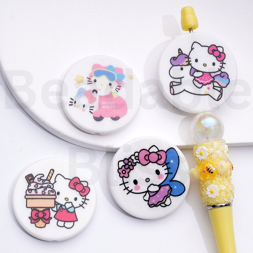 Cute HK Kitten with Blue Wings Ice Cream Drives a Car Unicorn Sanri Round Flat Acrylic Beads, Around 38MM