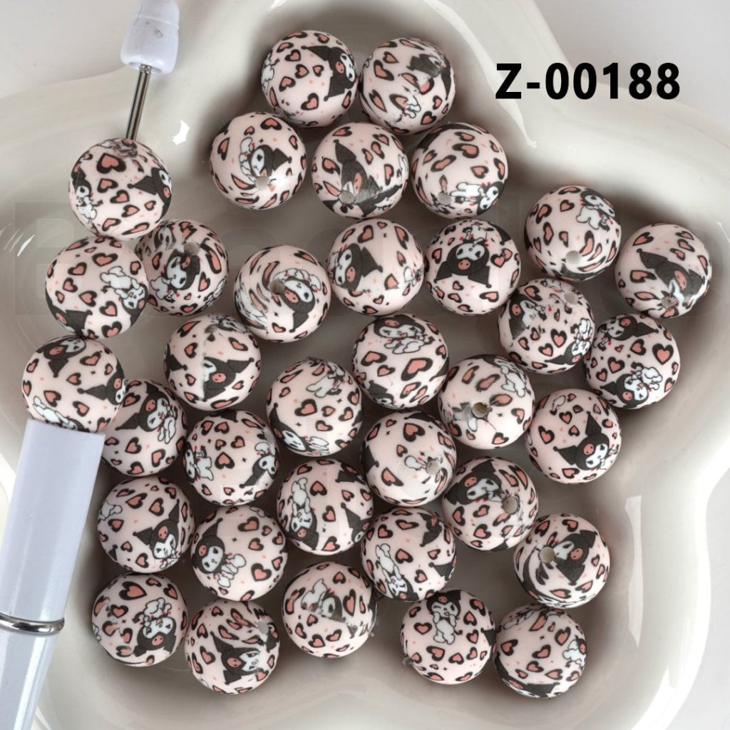 Cute Pink Heart Kurom Sanri Round Printed Silicone Beads 15MM, Number Z-00188