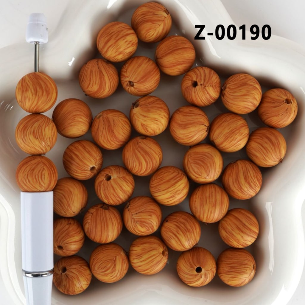 Dark Brown Wood Grain Round Printed Silicone Beads 15mm, Number Z-00190