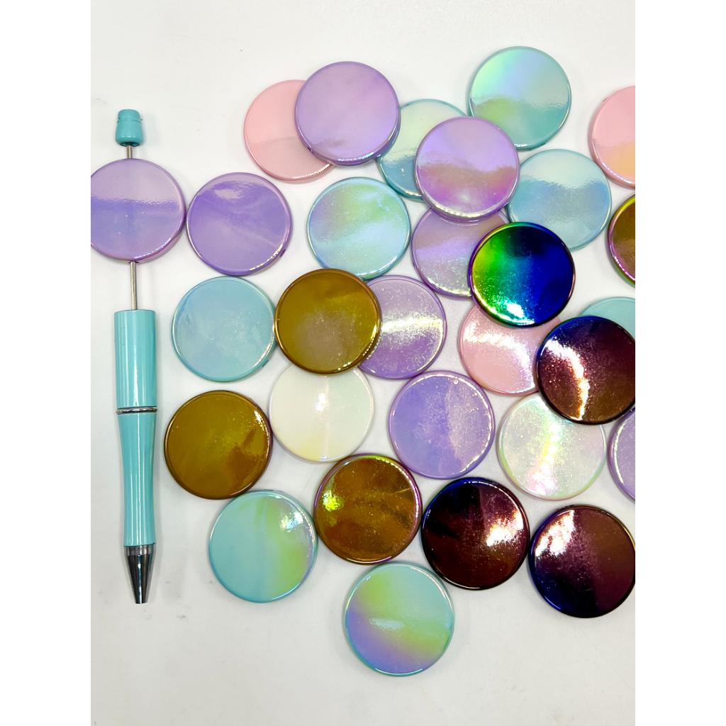 These Flat Round Beads, Flat Back Disk Acrylic Beads, Plain Background, Size 32mm, LD are perfect for adding a unique touch to custom pen designs. Made from durable acrylic with a flat back disk shape, they provide a smooth surface for decoration.