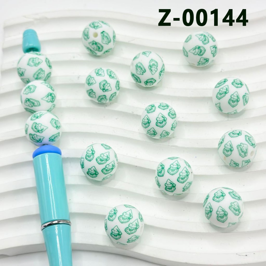 Green Grinc in a Christmas Hat White Round Printed Silicone Beads 15mm, Number Z-00144
