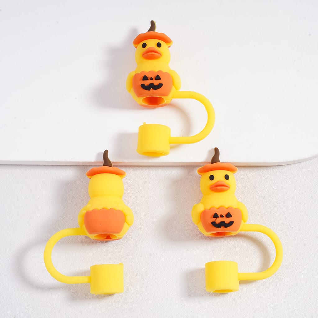 Little Cute Duckling Holds Ghost Face Pumpkin Halloween Food Grade Cup Tumbler Silicone Straw Topper