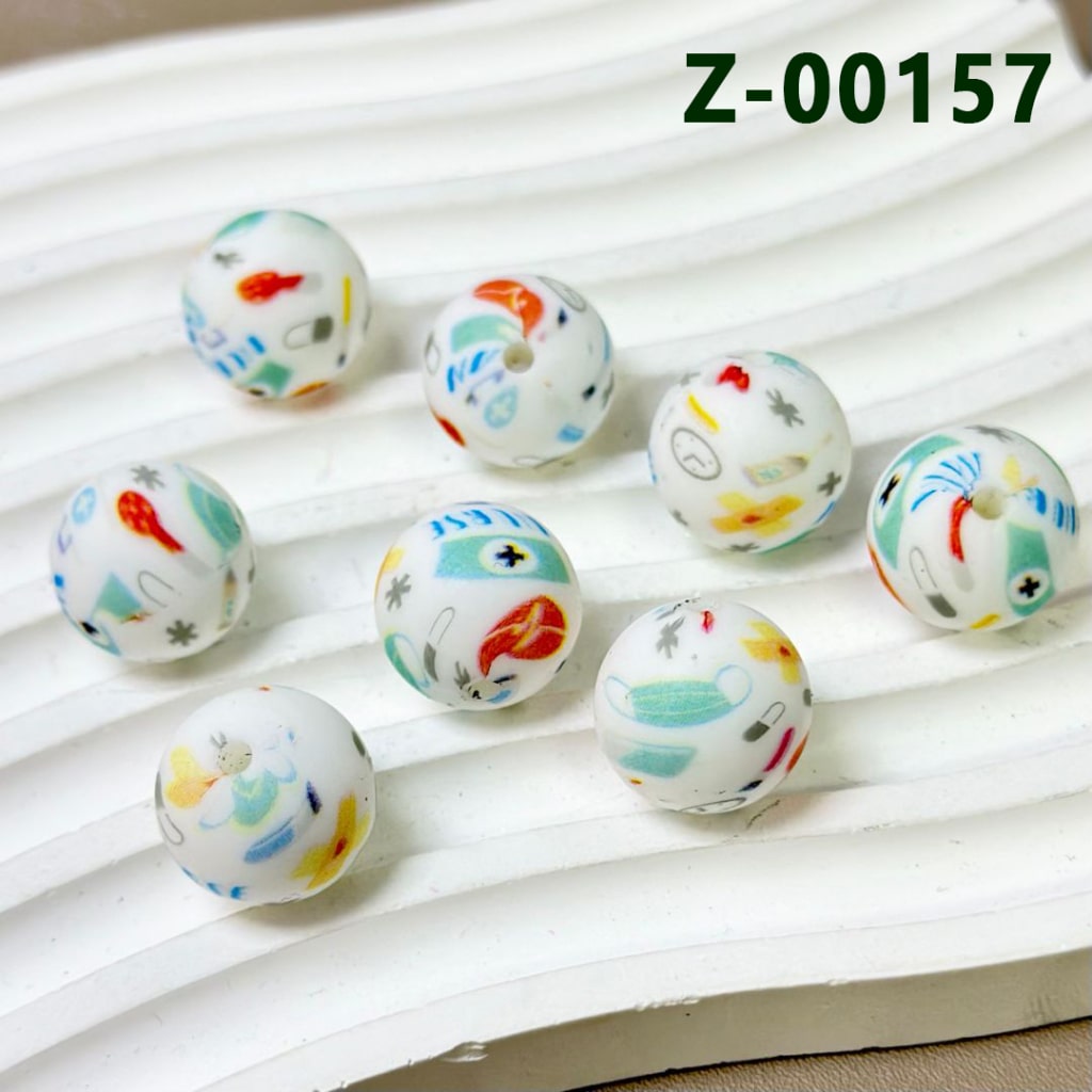 Nurse Doctor Mask Heart Bandaid Capsule Thermometer Needle Tubing Round Printed Silicone Beads 15mm, Number Z-00157