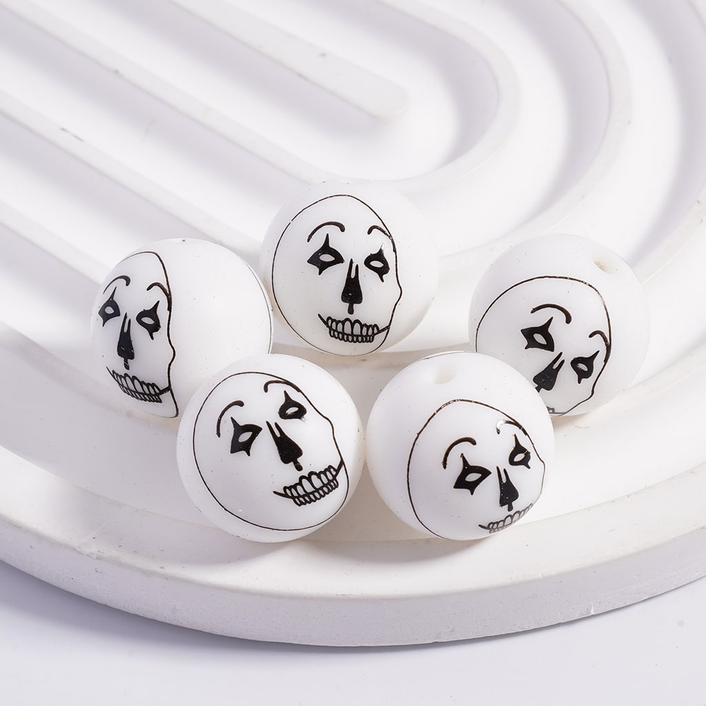 Printed Silicone Round Beads with Helloween Skeleton Face, White 15MM