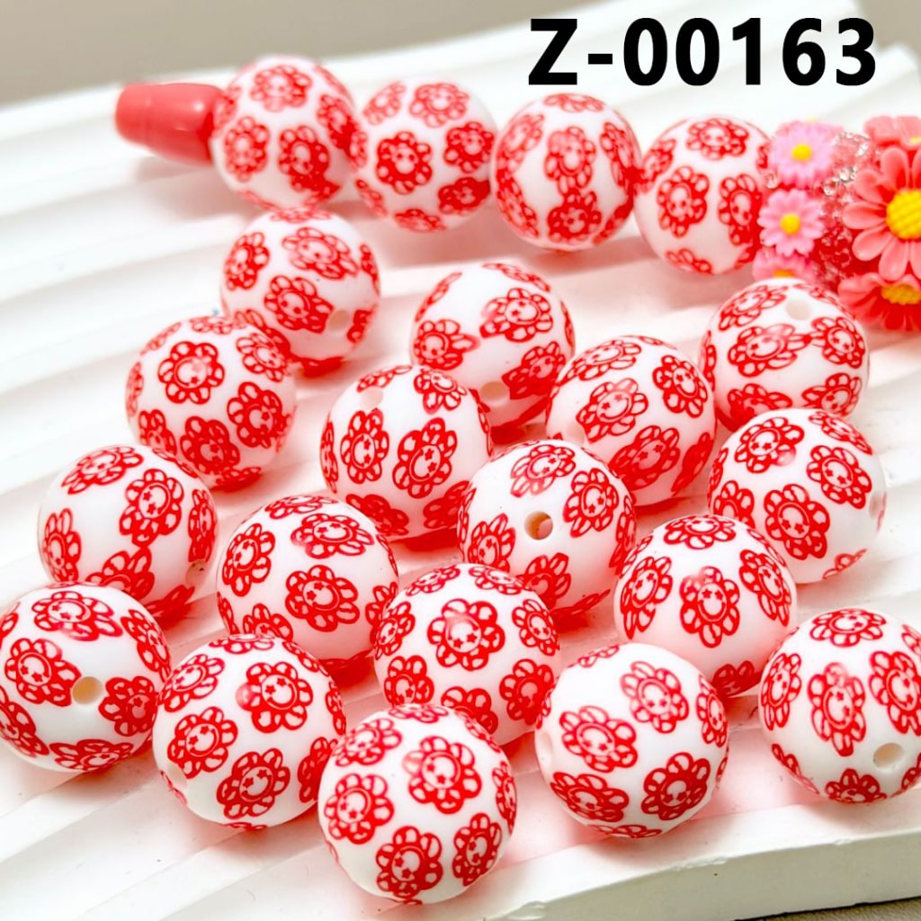 Red Smile Face Flower White Round Printed Silicone Beads 15mm, Number Z-00163