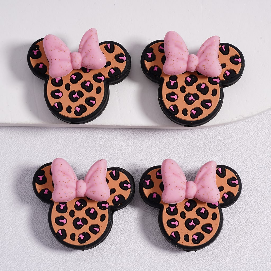 Silicone Focal Beads 3D Cute Jaguar Prints Minni Head with Pink Bowknot