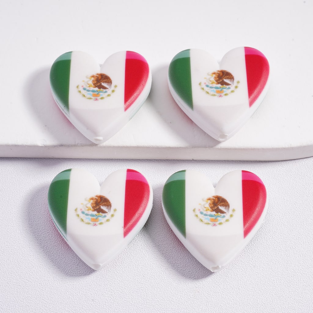 Silicone Focal Beads Heart Shape Mexico Flag Prints