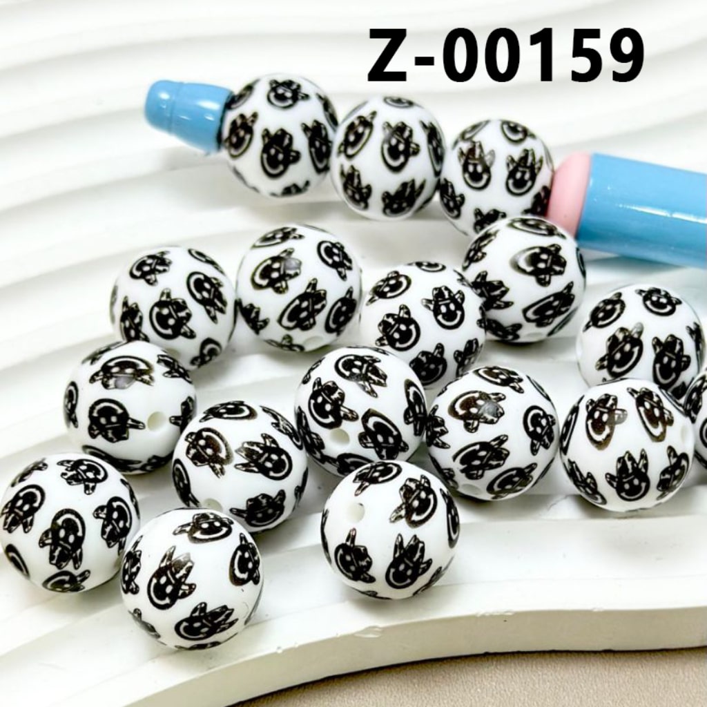 Smile Face with Cowboy Hat White Round Printed Silicone Beads 15mm, Number Z-00159