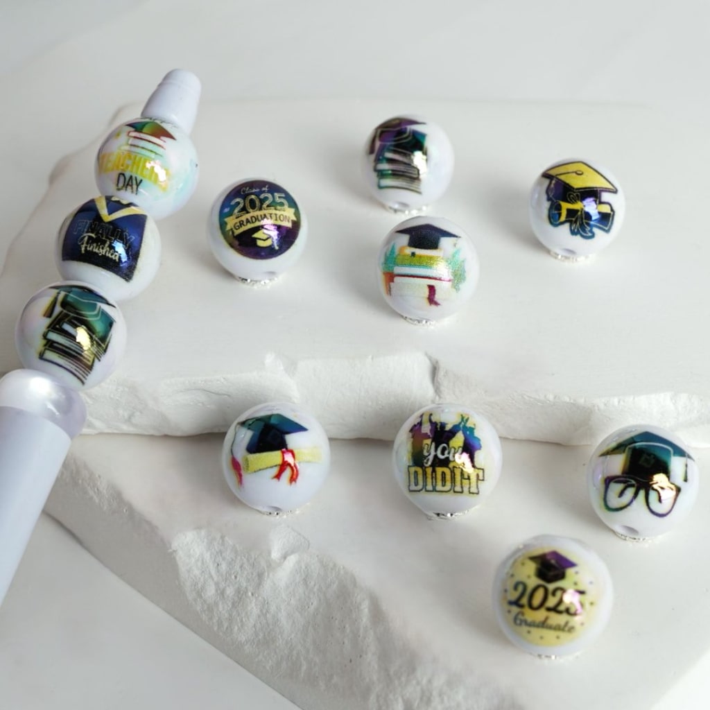 UV Coating 2025 Graduation White Round Acrylic Beads, 16MM, Random Mix